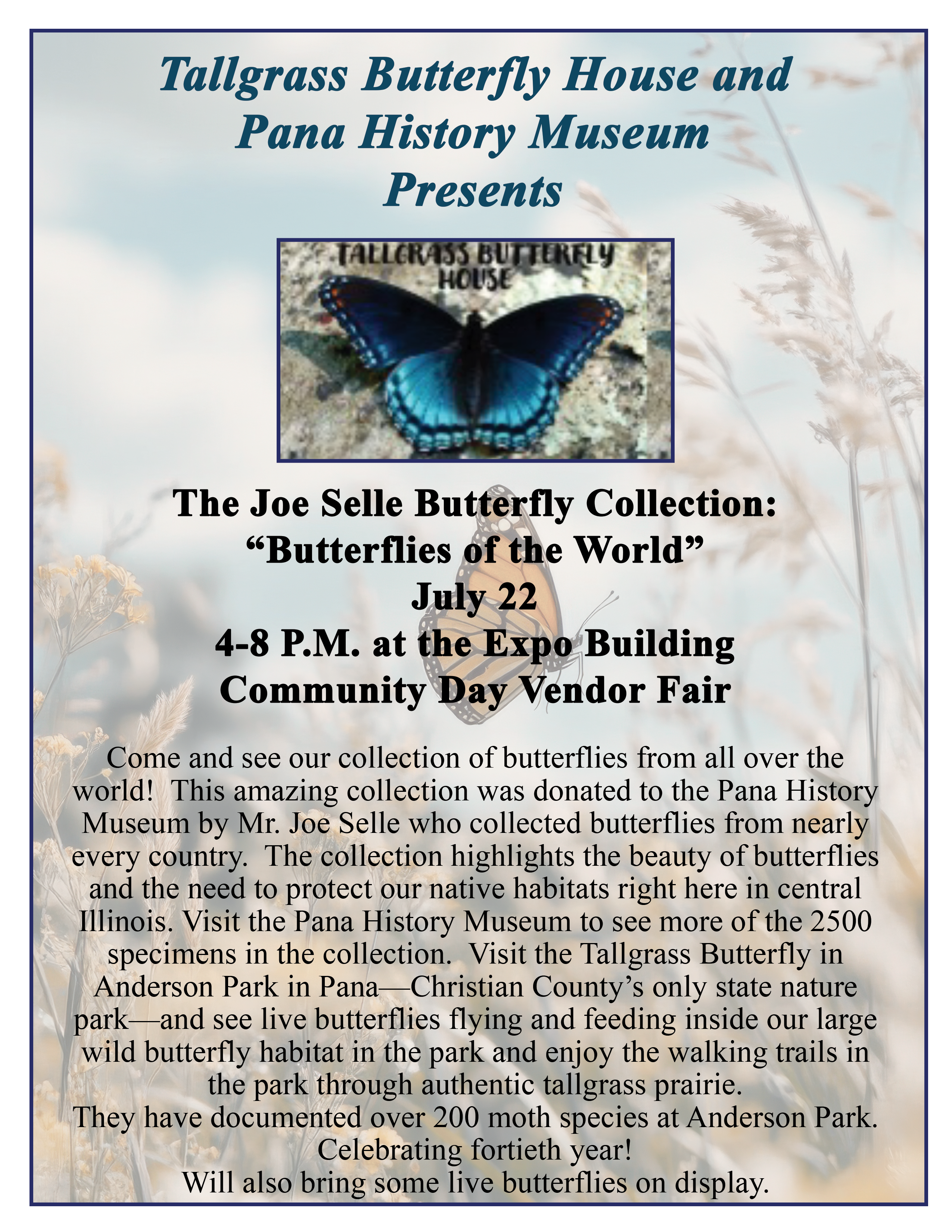 The Joe Selle Buterfly Collection: “Butterflies of the World” + Add to Google Calendar + iCal / Outlook export Date Jul 22 2026 Time 4:00 PM - 8:00 PM Category Event Expo Building Sponsors Pana History Museum Tallgrass Butterfly in Pana Share this event