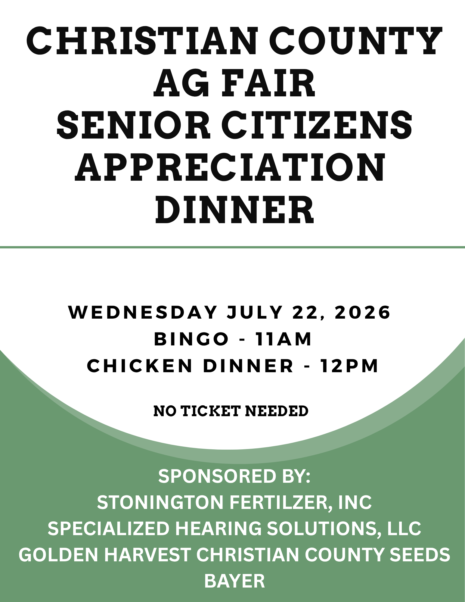 Senior Citizens Appreciation Dinner + Add to Google Calendar + iCal / Outlook export Date Jul 22 2026 Time 12:00 AM Category Beer Pavillion Event Sponsors BAYER Christian County Seeds Specialized Hearing Solutions Stonington Fertilizer Share this event