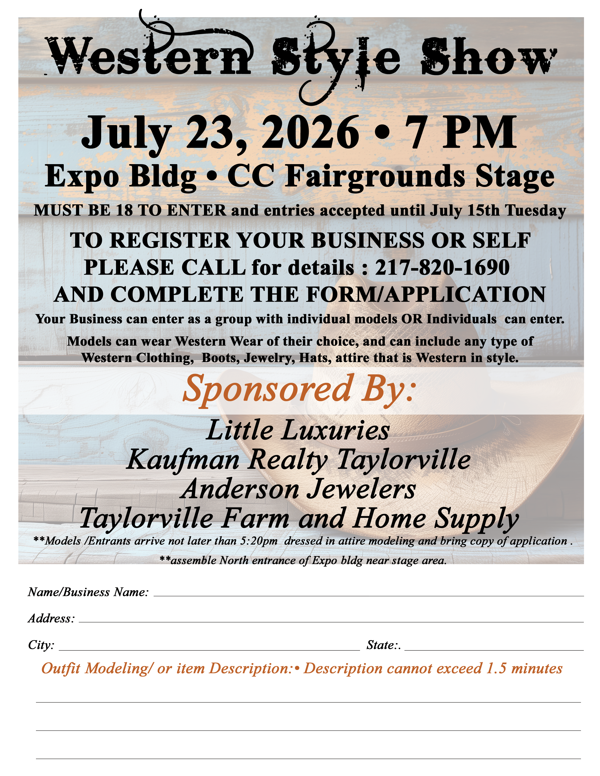 Western Style Show + Add to Google Calendar + iCal / Outlook export Date Jul 23 2026 Time 7:00 PM Location EXPO Building Fairgrounds Category Event Expo Building Sponsors Anderson Jewelers Kaufman Realty Little Luxuries Taylorville Farm & Home Supply Share this event